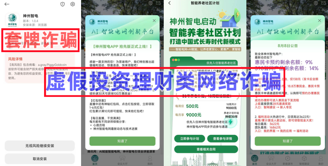 不法分子冒充香港某公司的名义,打着与“国家电网”合作的旗号,制作散布涉诈APP,声称参与者实名注册,每天听课学习,可领取惠民金,同时虚构推广“智能养老社区”“智网平衡”等高额返利理财项目实施诈骗。