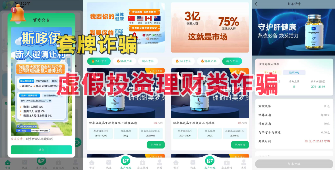 不法分子冒充湖南某公司的名义,打着生产研发保健品的旗号,制作散布涉诈APP,虚构推广“酸枣仁氨基丁酸复合压片糖果”“水飞蓟籽油”“酸枣仁氨基丁酸复合压片糖果”等高额返利理财项目。