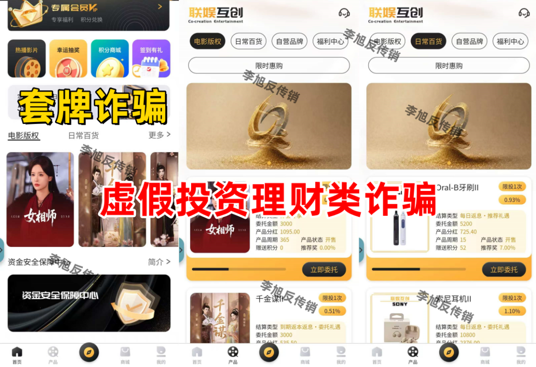 不法分子冒充香港某影视投资公司的名义,打着影视投资、供应链采购销售等旗号,制作散布涉诈APP,虚构推广“影视投资”“日常百货”“宣发助力”等高额返利理财项目实施诈骗。