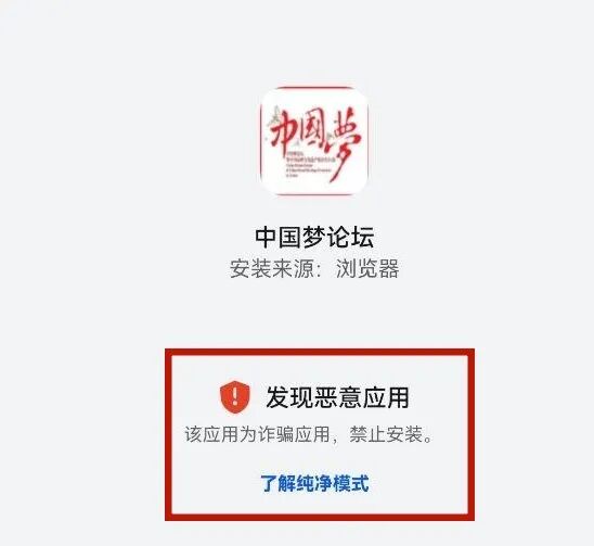 下载“中国梦论坛”APP,显示是病毒软件,是诈骗软件。查到该项目网站搭建在国内,系非法网站。