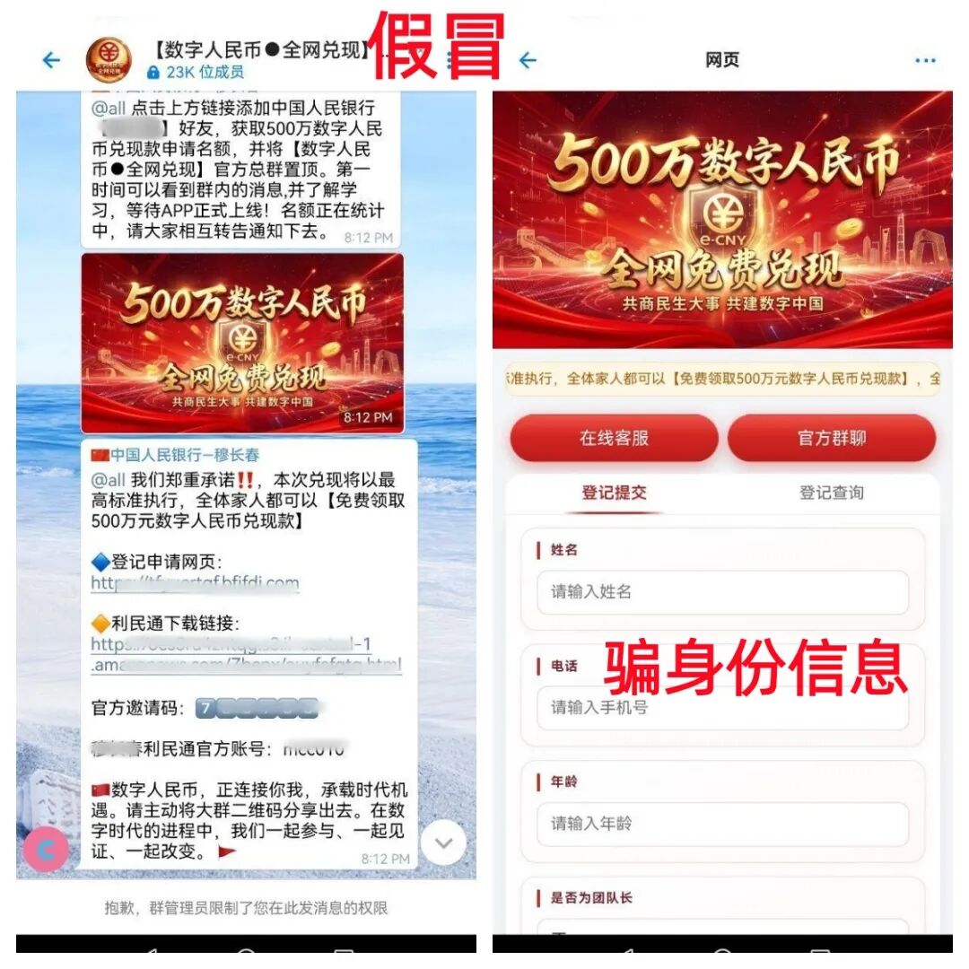 网络中出现了“500万元数字人民币全网兑现”项目,该项目宣传提交身份信息就可以申请500万元数字人民币兑现款?这是一眼假的诈骗,哪有白给500万元的好事情?这是骗取参与者身份信息,想拿到500万元,就会被要求交各种费用或者帮助骗子转移诈骗资金的圈套,请大家提高警惕,别泄露自己的身份信息,别贪图骗子抛出的“高额回报”,以免上当被骗。