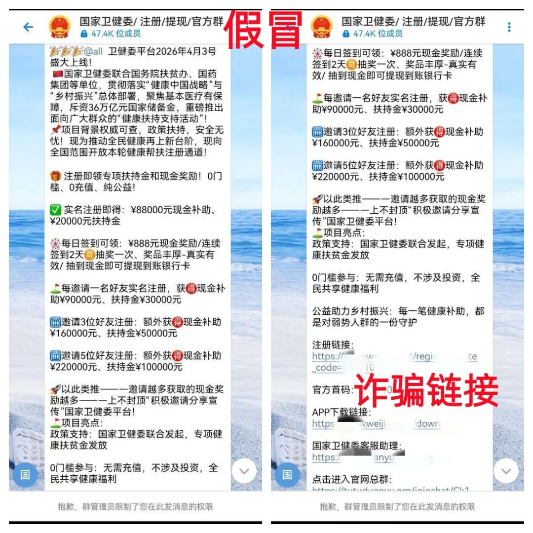 4月3日网络中上线了假冒国家卫健委的“国家卫健”APP,该项目宣传“实名认证注册就获得88000元现金补贴,20000元扶持金,每天签到获得888元现金奖励,邀请1人注册,获得90000元,扶持金30000元...................”?这是一眼假的骗局!