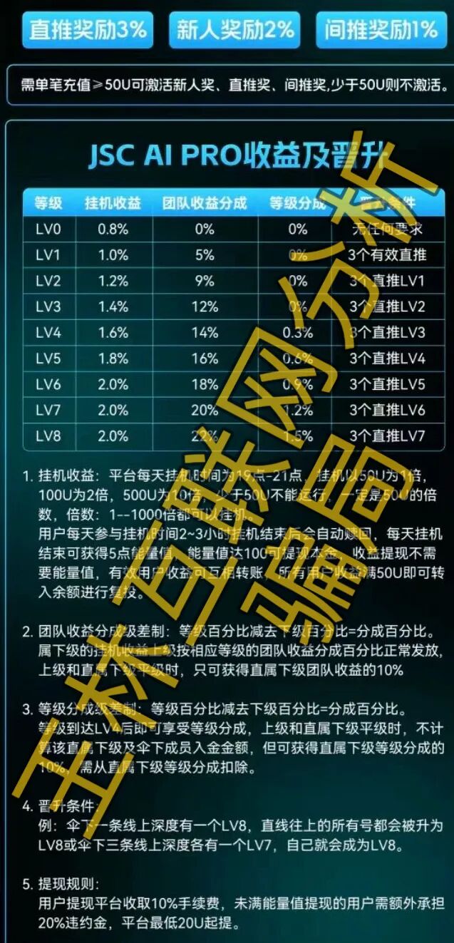 分红类资金盘骗局,正规量化交易,是用算法在市场里做交易,赚的是市场波动的钱,收益是不确定的,有亏有赚,根本不可能给你“保本、日结、固定收益”。这个项目不仅是资金盘,还是传销式资金盘,参与其中不仅会血本无归,还可能触犯法律,承担刑事责任,远离...
