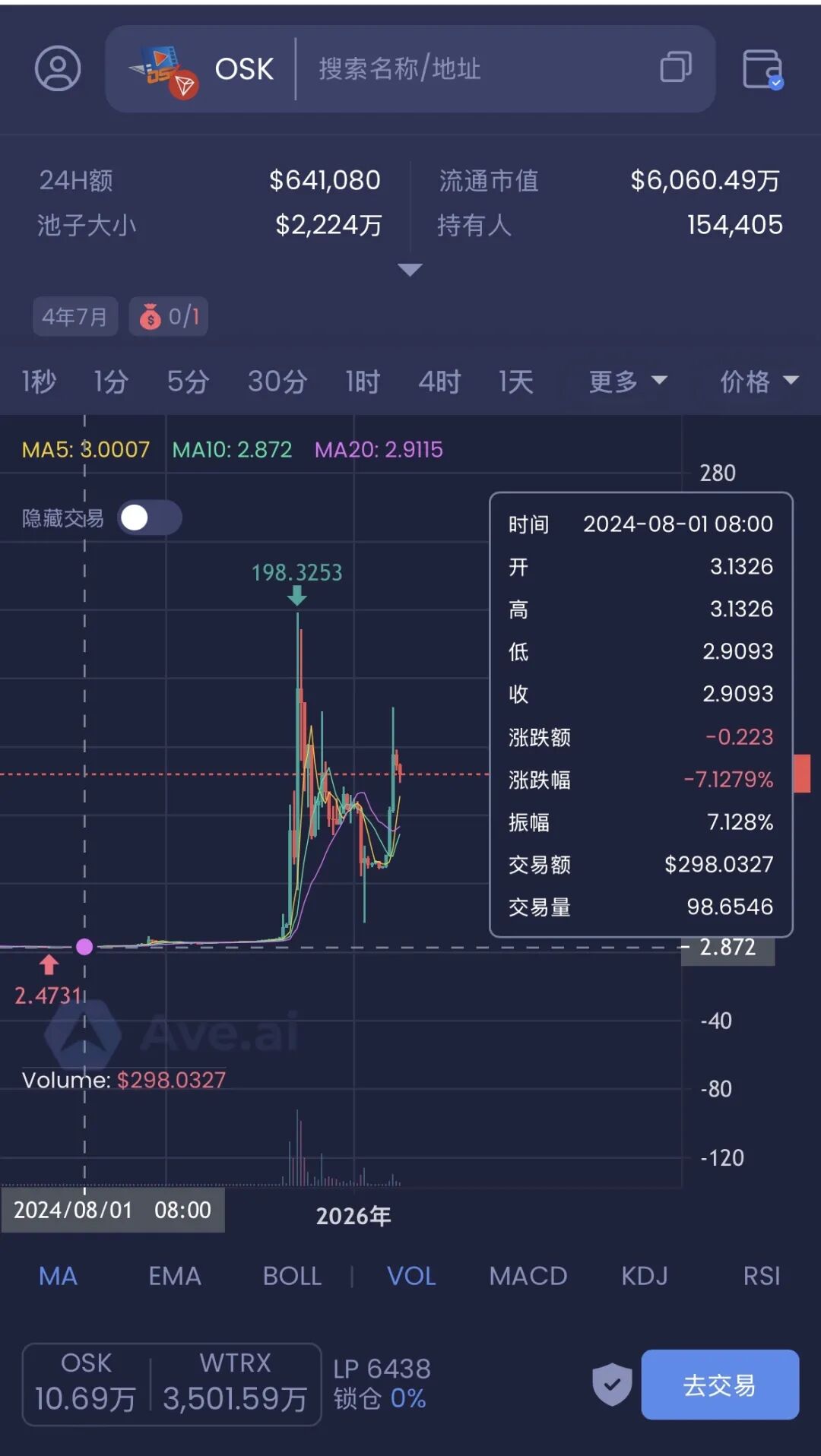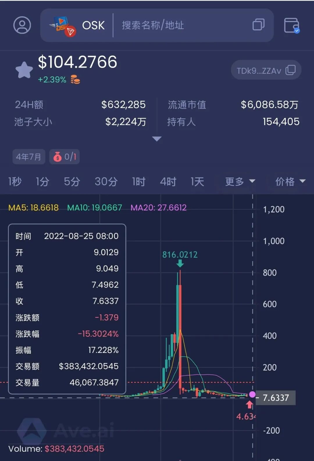 关于OSK代币,发行于2021年8月,曾经在短短的一年时间从几美金拉升最高816美金,也是拉升了几百倍的神话,高位下跌至归零一断时间,几乎都是韭菜投入的本金夭折在夭折。