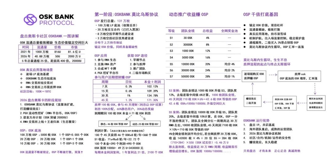全是用数学游戏算出来的理想情况,现实中只有项目方和顶层头目能赚到钱,99%的散户都是接盘侠, 莫比乌斯内循环:自欺欺人的“锁仓割韭菜”所谓“莫比乌斯协议、质押OSK、OSP池增厚、汇率涨”,本质是强制锁仓、限制提现的套路:让你把币质押进去“生息”,看似“币生币、汇率上涨”,实则是把你的钱牢牢套住,不让你提现;所谓“OSP千倍打底基因、真实应用落地”,全是包装话术,没有任何真实应用场景,就是用“内循环”制造“币价上涨”的假象,吸引更多人进场;
