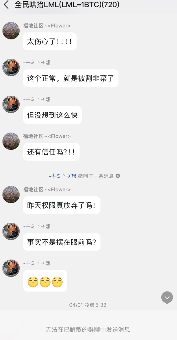 最惨的是,这次被割的很多人,就是上次“LL拉拉永动机”的受害者。第一次崩盘时,操盘手说“通道被打死了”,承诺“平移新项目全额解套”。很多人抱着回本的侥幸心理,没跑,还继续投钱、拉亲友。以为是翻身机会,结果是跳进更深的坑。LML上线没多久,就“黑客攻击”了,币价跌了99.9%,所有资产瞬间清零。